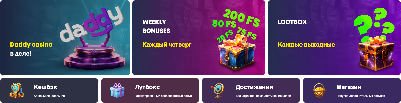 Casino Daddy стало популярным благодаря наличию лицензии, бонусам с минимальным вейджером (до x40-50) и многоуровневой программе лояльности. Создайте профиль на платформе, чтобы пользоваться бонусами и получить доступ к более чем 3500 автоматам.